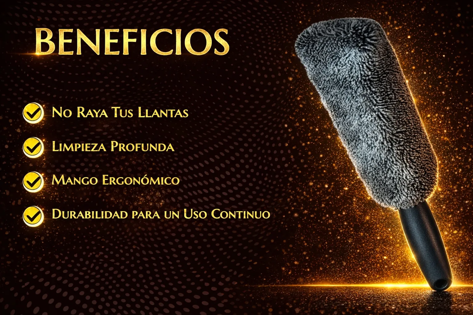 - Limpieza Profunda: El diseño único de microfibra permite llegar a los rincones más difíciles de tus llantas, eliminando eficazmente la suciedad, residuos de frenos y otros contaminantes para dejar tus llantas impecables.
