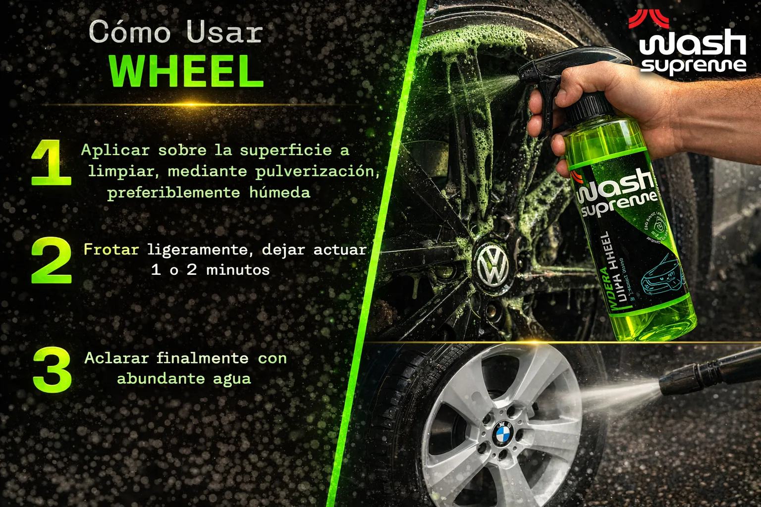 Con su PRESENTACIÓN de 500 ml en formato pulverizador, WHEEL es la solución perfecta para quienes valoran la limpieza, el cuidado y el brillo en sus llantas.