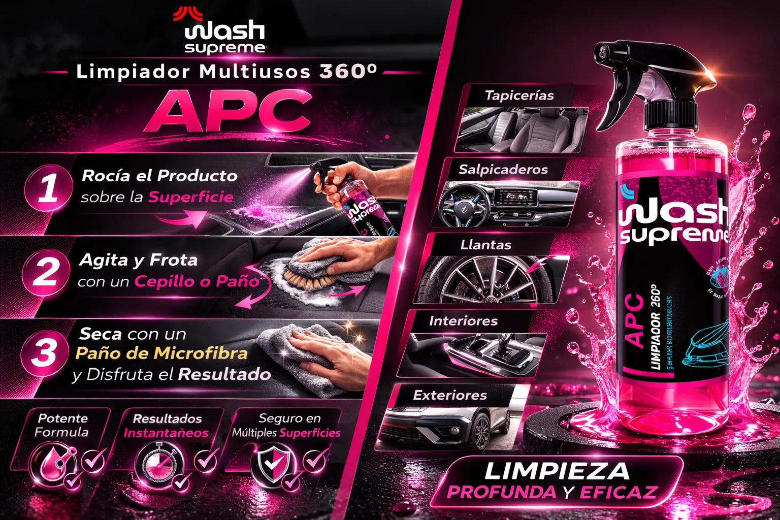 - Multifuncional: Diseñado para limpiar desde carrocería y llantas hasta tapicerías y alfombrillas.